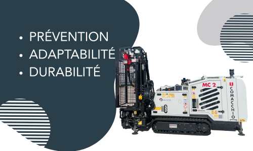 Chez Foraloc, nous avons investi dans des équipements spécifiques pour répondre aux besoins croissants de cette technique. Nous proposerons prochainement à la location la Comacchio MC 2, une foreuse compacte de micro-fondation idéale pour les travaux de reprise en sous-œuvre. Le travail en espace confiné est facilement réalisable grâce à son mât de de 1 000 à 2 250 mm. De plus, elle fonctionne en thermique ou en électrique en mode travail, ce qui lui permet de s'adapter à des environnements divers.